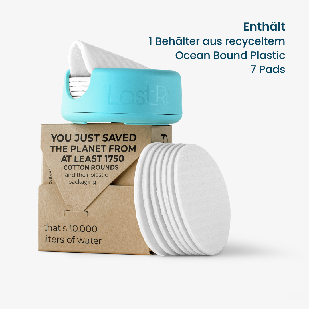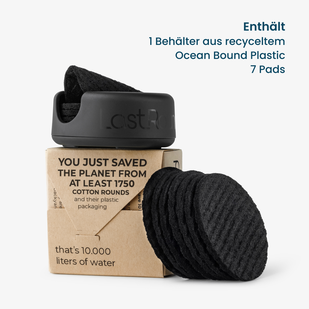 Enthält 21 kompostierbare Pads, ein Behälter aus recyceltem Ocean Bound Plastik und einen praktischen Wäschebeutel.