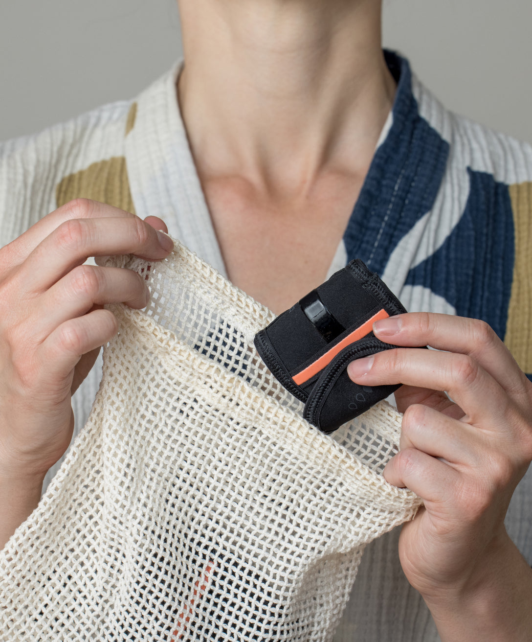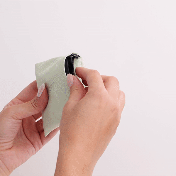 Kun on aika vaihtaa side, taita se varovasti ja laita se takaisin pussiin, se ei vuoda. Säilytä sitä, kunnes on aika pestä pyykkiä. Odota, että