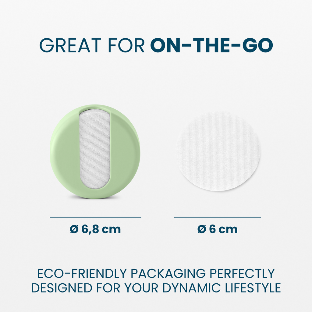 Reusable rounds made of a shape-shifting fabric that feels just like regular cotton rounds when wet. Contains 1x Case Made From Recycled Ocean Bound Plastic, and 7x Reusable Rounds. Replaces +1750 single-use rounds.